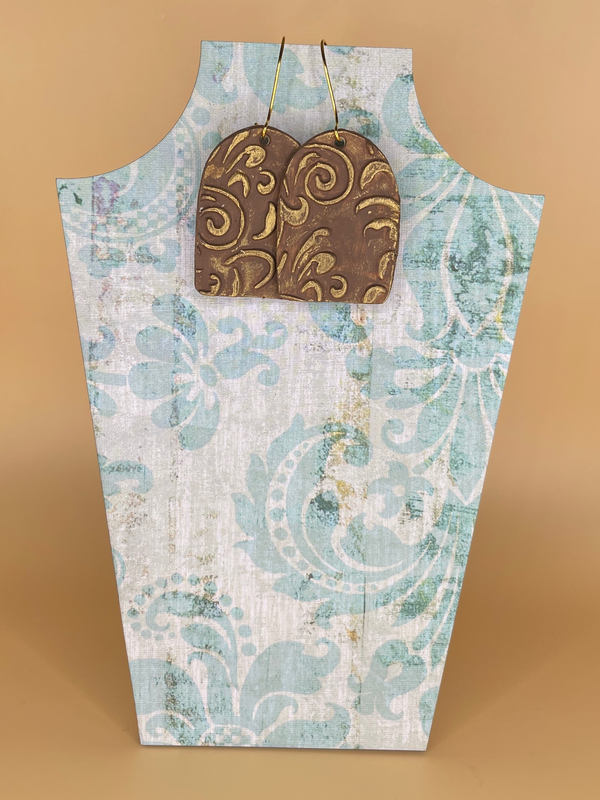 Make a statement with these gorgeous earrings. Handcrafted from lightweight polymer clay and then hand-painted a rich coffee brown with gold accents.