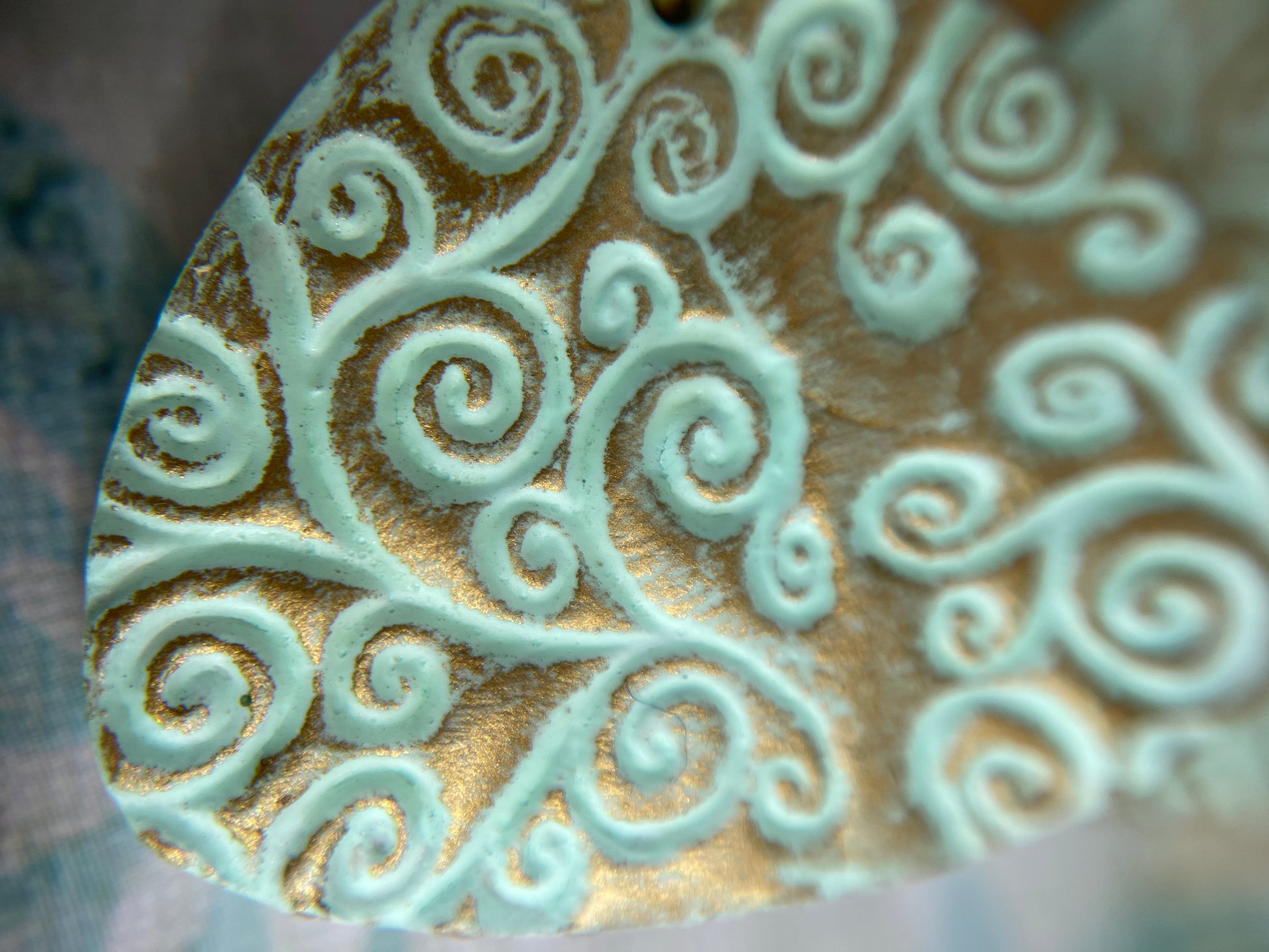 Whimsical golden swirls decorate the polymer clay surface of these earrings. They are finished with gold toned findings.